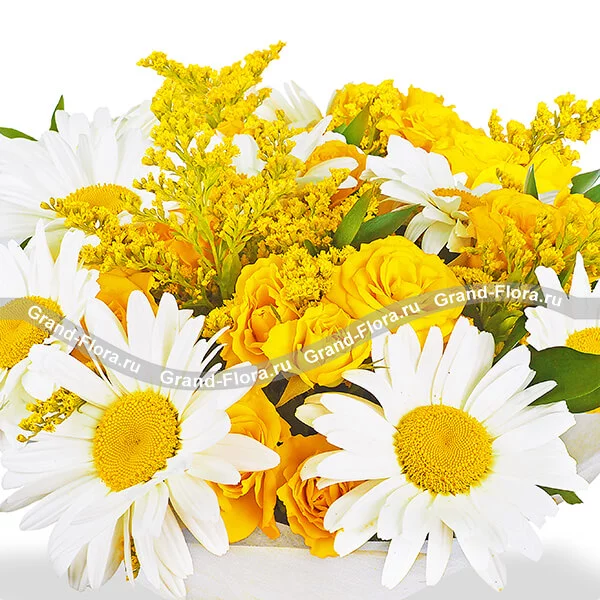 ЛЮКС: ромашка белая - 11 шт, роза кустовая желтая - 8 шт, солидаго - 7 шт, рускус, фетр светлый, желтый бант.