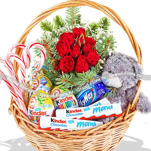ЛЮКС: роза красная кустовая - 3 шт., гипсофила - 3 шт., еловая ветвь, Мишка Teddy - 20 см, рождественские конфетки - 7 шт., Kinder Сюрприз - 6 шт., Kinder Chocolat max - 6 шт., MilkaWay - 1 шт., оазис, корзина большая.