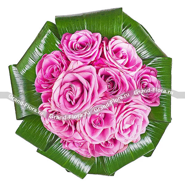 Букет из нежно-сиреневых роз, в обрамлении листьев аспидистры - это королевский подарок для утонченной и немного взбалмошной особы, привыкшей жить, как настоящая принцесса из сказки 12 месяцев, готовая послать за подснежниками с самый лютый мороз.
