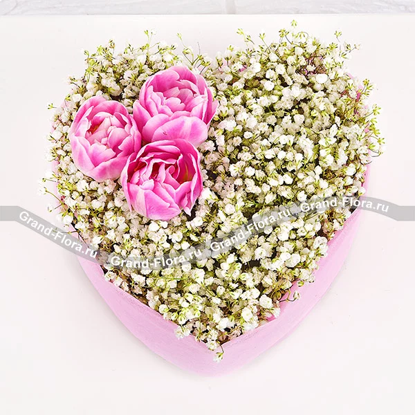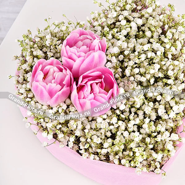 Волшебство любви - сердце с гипсофилой и тюльпанами